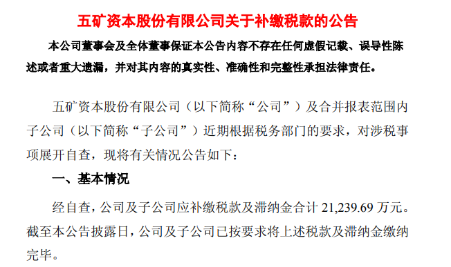 1月7日,五矿资本(600390.SH)发布关于补缴税款的公告:经自查,公司及子公司应补缴税款及滞纳金合计21239.69万元。截至本公告披露日,公司及子公司已按要求将上述税款及滞纳金缴纳完毕。