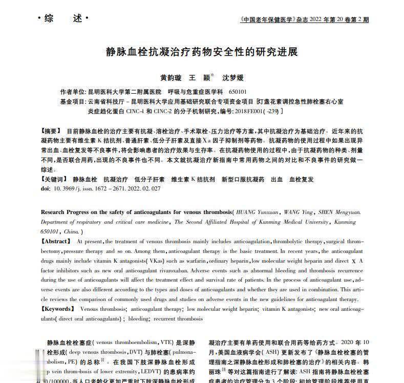 参考文献[1]黄韵璇,王颖,沈梦媛.静脉血栓抗凝治疗药物安全性的研究进展[J].中国老年保健医学股点网,2022,20(02):98-101.